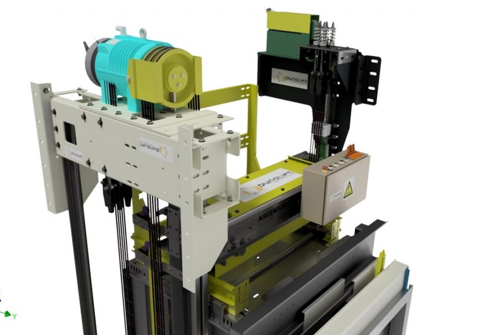 Máquina de tracción, control de mando, botoneras, sistema suspensión 2:1 y seguridades, componentes eléctricos, cabina y accesorios, puertas, chasis de cabina.